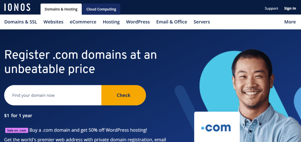 • 折扣托管:通过 IONOS 购买 .com 域名后,可享受 50% 的 WordPress 托管折扣。这是开设博客或基本网站的好选择。